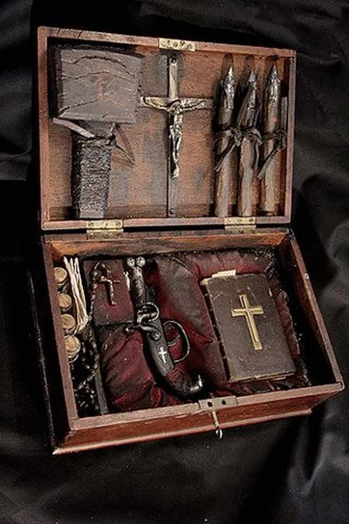 Early 19th Century French Vampire Hunting Kit. https://pbs.twimg.com/media/DLhazFQX4AA37W-.jpg https://twitter.com/FabulousWeird/status/916582370022776832 !foto