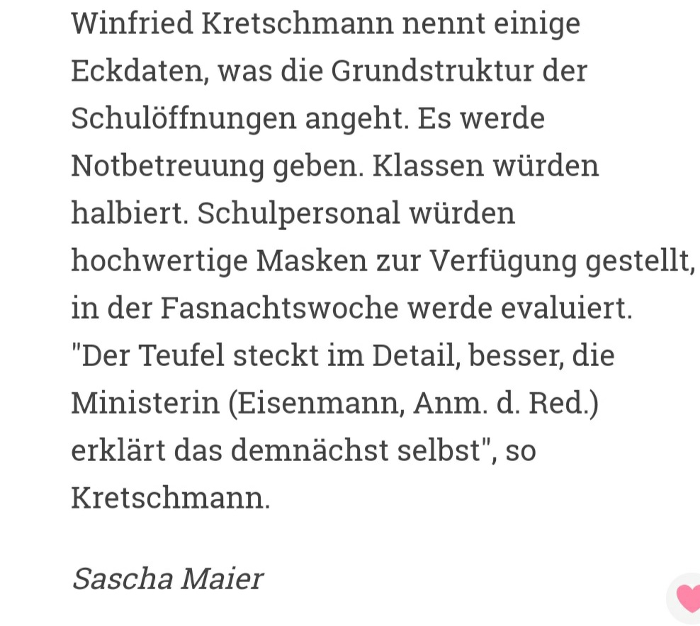 ♲ @RegierungBW@twitter.com: Zwei bestätigte Fälle sind bereits nachgewiesen. 21 weitere Infektionen wurden festgestellt, die jetzt untersucht werden. Die Entscheidung über die Öffnung von Kindertagesstätten und Grundschulen muss deshalb verschoben werden. 2/2