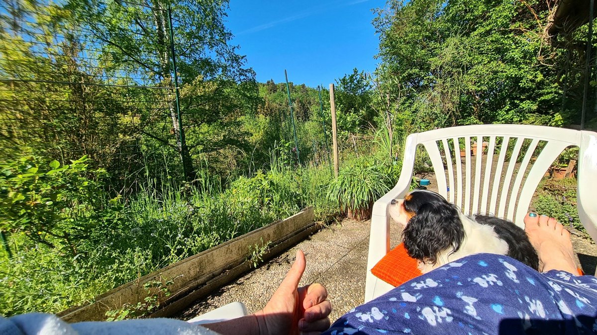 (Mein twitterdings bietet wohl keine echte Bildbeschreibung, also: sonnig blauer Himmel, wilder großer Garten mit Wald im Hintergrund, vorne ein Cavi, Hund am Bein einer Frau, die den Fuß auf einem Gartenstuhl hat und den Daumen hoch hält). pbs.twimg.com/media/FSs857gWYA… -